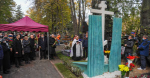 На могиле Марка Захарова на Новодевичьем кладбище установили занавес и крест
