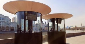 Так теперь будут выглядеть кассы для речных перевозок на прогулочных маршрутах. Кассы-грибы появились в дополнение к причалам-шайбам, которые используются для электросудов — речных трамвайчиков.