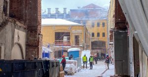 Выяснилось, что горит здание Шевалдышевского подворья на Никольской улице. Задние расположено рядом с ГУМом и затянуто фальшфасадом: оно находится на реконструкции.