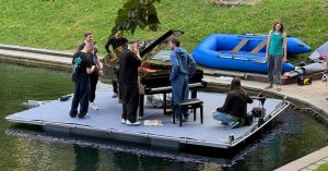 Сегодня вечером на пруду состоится один из заключительных концертов летнего проекта «Театральный бульвар». В программе выступление пианиста Никиты Тонконогова, которое пройдет в формате перформанса прямо на воде. Сейчас на месте идет репетиция: рояль скользит по пруду, а музыкант пробует играть в движении.