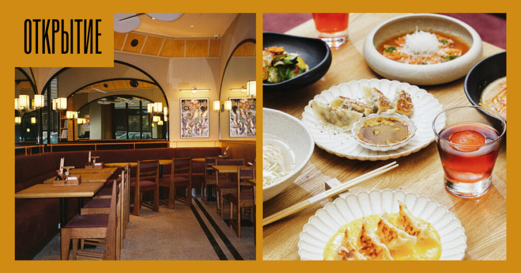 Из конкретных позиций заявлены капучино рамен с курицей (бульон, взбитый в пену, и томленая грудка), гедза с креветкой с хрустящей корочкой, открытый ролл с угрем и фуа-гра — сочетание, которое «отражает общий подход команды: классические японские техники и неожиданные решения внутри».
