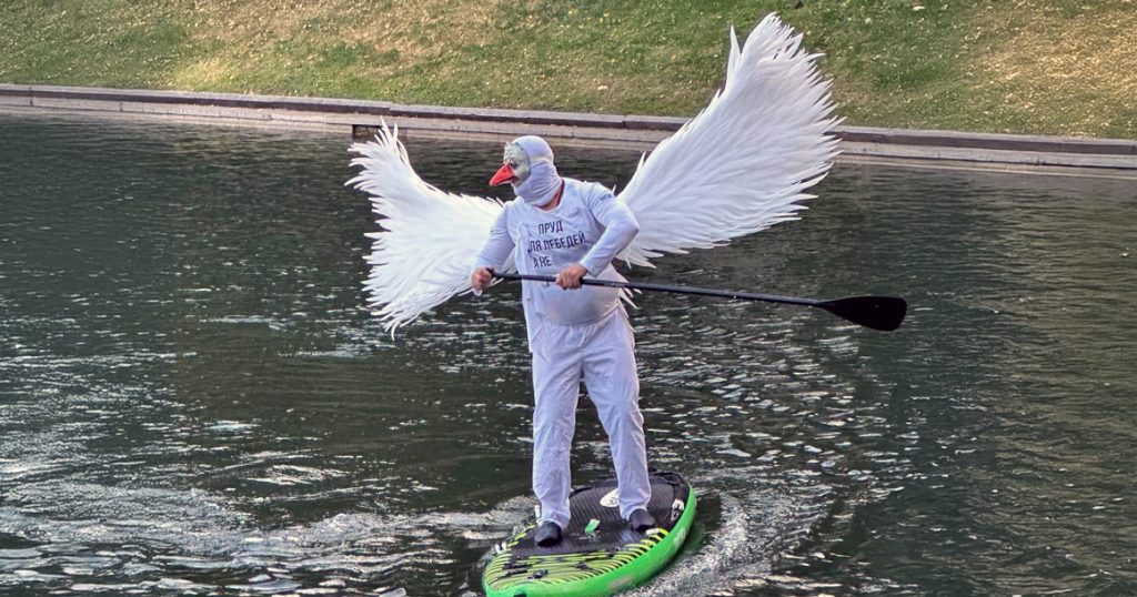 Нелепого вида мужчина оделся во все белое, натянул на себя крылья и клюв и выдвинулся на сапборде к центру пруда. Но в какой-то момент он не удержал равновесие и упал в воду.