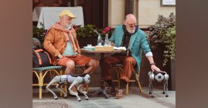 На фото двое очень хорошо одетых пенсионеров вальяжно попивают боржоми и поглаживают своих механических друзей. Обе собаки на очень хитро сконструированных шлейках, зато никто не обвинит, что дедули выгуливают питомцев без поводка.