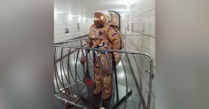 День космонавтики сегодня празднуют много где в Москве, в том числе, как бы парадоксально это ни звучало, под землей. В переходе между станциями метро «Ленинский проспект» и МЦК «Площадь Гагарина», например, установили фигуру космонавта. Если говорить точнее, это образец настоящего скафандра «Орлан-М» — так пишут на сайте московской мэрии. Скафандр там называют интересным экспонатом.