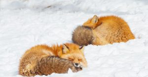 А с наступлением темноты лиса в детский сад вернулась. Да не одна, а парочкой — возможно, они выбирали, куда пристроить будущих лисят. Но в итоге они свернулись калачиками, да так и уснули прямо на игровой площадке рядом с качелями.