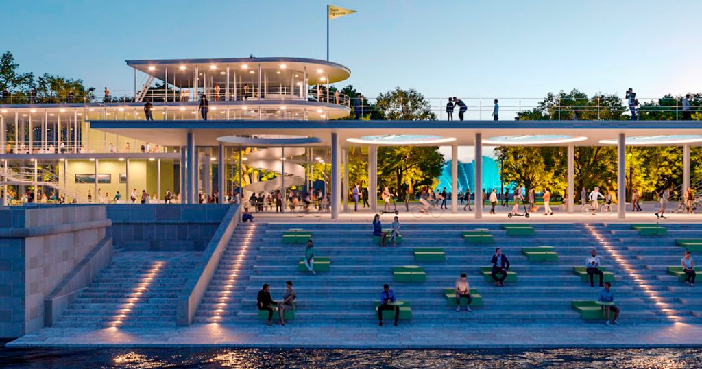 По картинкам еще видно, что из главного причала хотят сделать некий амфитеатр на воде, расположив там даже сиденья в стиле Гарри Нуриева, как у «ГЭС-2», только зеленые. Зато на рендерах не наблюдается толп туристов, которые там, очевидно, будут, особенно когда откроются многочисленные павильоны с сувенирами.