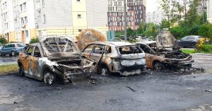 Пожар был заметен издалека: клубы дыма снимали жители окрестных многоэтажек. Как стало известно позже, пожар начался с одной машины, но потом огонь перебросился на припаркованные рядом. Все три автомобиля сгорели дотла — в результате машины, запечатленные на фотографии, просто не узнать.