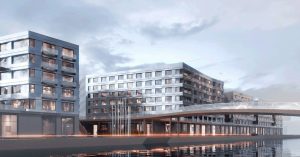 Еще один вариант опубликовал телеграм-канал «Стройки — и точка». На визаулизациях сами здания выглядят как серые коробки с окнами в пол — ничего необычного. Но внимание привлекает пешеходный мост на тонких ножках, который архитекторы предлагают построить через Водоотводный канал.