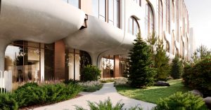 Рендеры мини-сквера с ландшафтным дизайном опубликовало архитектурное бюро Gafa. «В проекте перед нами стояла задача переосмыслить концепцию ландшафта жилого комплекса от американского бюро Oda. Неординарные фасадные формы вдохновили нас на создание гибкого живописного ландшафта и интерпретацию архитектурных мотивов в концепции игровой зоны», — рассказывают архитекторы.