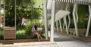 Смотрим дальше. Рабочие места защитят от солнца и дождя перголой, по которой смогут гулять люди, а рядом установят детские площадки. То есть рядом с рабочей зоной, и даже в буквальном смысле над головами, будут бегать дети, шуметь гуляющие жильцы. Как в этих условиях можно будет нормально работать — не очень понятно. Если только в наушниках. Оригинальные «подвесные рабочие кабинеты» (лавочки и столы, свисающие с перголы на цепях) тоже вызывают сомнения в их удобстве.