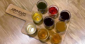Выпускающий редактор «Москвич Mag» уже побывала в рюмочной и говорит: сюда нужно идти именно за настойками. Они здесь самодельные, хорошие, разнообразные. Есть на черной смородине, на облепихе, на клубнике, на щавеле. Можно взять отменную хреновуху. Но вообще «Авангард» позиционирует себя не только как рюмочную, но и как бар — здесь можно найти и пиво, например.