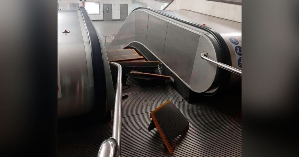 В социальных сетях появилась фотография, на которой видно, что ступени буквально вырваны, видимо, что-то пошло не так в месте, где эскалатор уезжает под платформу.