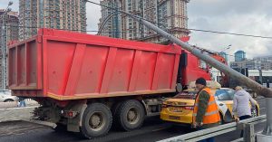 На Строгинском мосту упал фонарный столб. Повезло, что на кузов «КамАЗа»