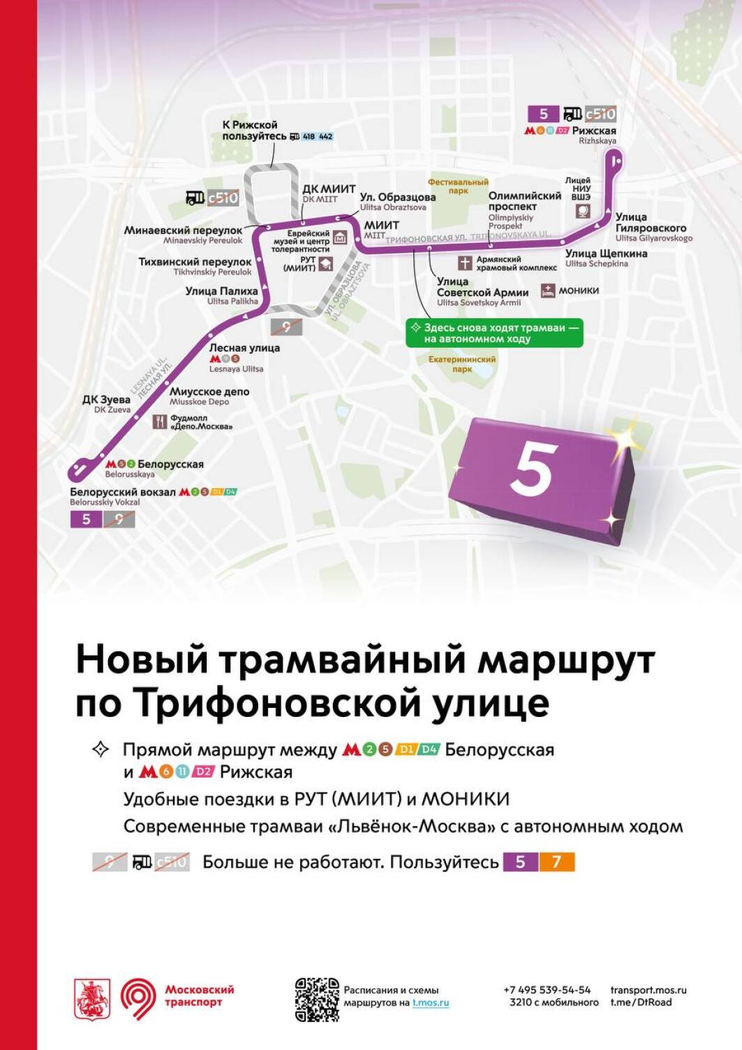 Вчера вечером все внимание публики было приковано к делу Долиной, а Сергей Собянин тем временем работал — открывал движение по Трифоновской улице. Маршрут №5 теперь соединяет Белорусский и Рижский вокзалы, время в пути составляет около 20 минут. Особенно полезен он будет студентам РУТ (МИИТ), поскольку корпуса расположены по пути следования.