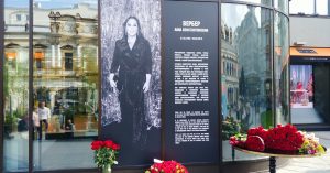 Кстати, ЦУМ уже сделал импровизированный мемориал, посвященный своей иконе — установил ее портрет в полный рост у входа в магазин и поставил стол для цветов. Которым, конечно, не хватило места — москвичи кладут их к подножию портрета.