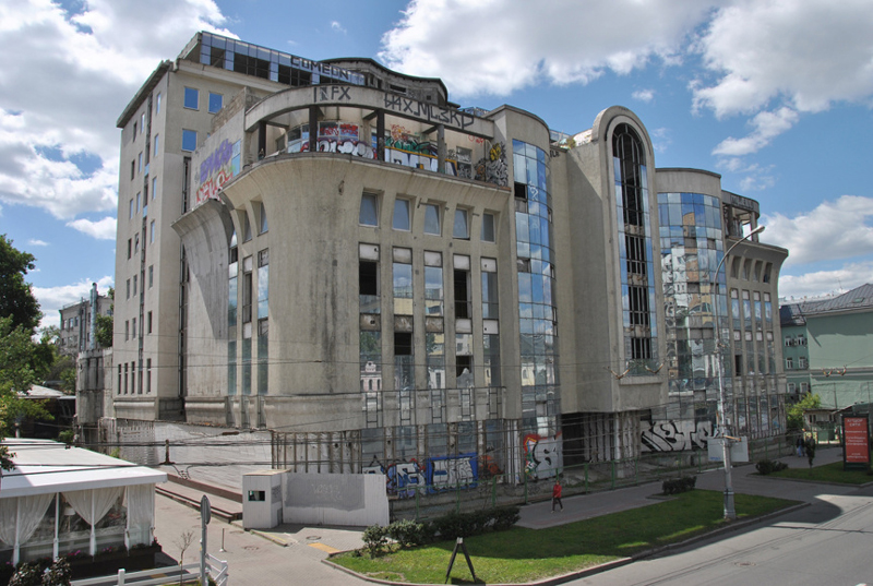 Громадное здание начали строить в конце 1990-х и никак не могли закончить из-за проблем с деньгами и законом у инвесторов, которых находила Быстрицкая. Стройка встала в 2005-м. Центр называли одним из самых дорогих московских долгостроев — он стоял огороженный без окон, а голые стены и фасад постепенно покрывались граффити.