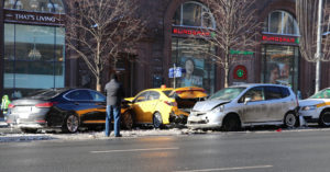 В районе дома 9 по Тверской в 10.35 столкнулось пять машин, одна из них такси.