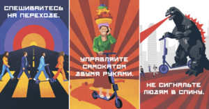Серия плакатов называется «Кодекс самокатчиков». Работы через отсылки к поп-культуре показывают все основные правила вежливого поведения для тех, кто выбрал поездку на самокате: управлять только двумя руками, на переходе спешиваться, не кататься вдвоем, нормально парковаться, не гонять среди толпы и не сигналить людям в спину (о да, это бесит больше всего).