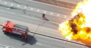 Видно, что к моменту взрыва машина уже горела, к ней приехали пожарные. Один даже достал шланг и побежал тушить, но в этот момент рвануло. Мужчину чудом не задело.
