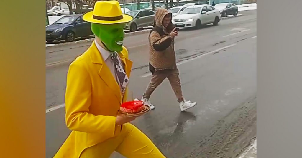 Видео опубликовал телеграм-канал «Москва на максималках». На нем видно, как мужчина в ярко-желтом костюме, в шляпе и зеленой маске на лице переходит дорогу в неположенном месте. В руках он несет блюдо с куском торта — возможно, из близлежащей «Пятерочки», которая тоже попала в кадр.
