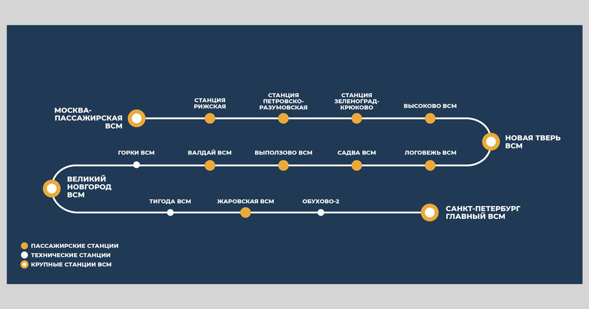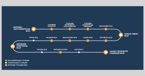 На первой в России высокоскоростной железнодорожной магистрали (ВСМ) Москва — Санкт-Петербург будет 16 остановок, 14 из них — пассажирские. Вокзалы и станции будут возводиться с нуля. Общее время в пути из Москвы до Твери составит 39 минут, до Валдая — 1 час 15 минут, до Новгорода — 1 час 41 минуту, а до Санкт-Петербурга — 2 часа 15 минут.