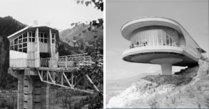 Фото: Водосборная башня плотины Медео в Алматы, 1969–1972; Геворг Кочар. Столовая Союза писателей Армении на Севанском полуострове, 1963