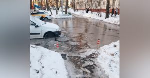 Машины, оставленные на парковке на Жигулевской улице, в результате оказались в огромной луже, скованной льдом. Проблема в том, что автомобили — это не ледоколы и даже не новые речные электротрамвайчики, которые успешно справляются с битым льдом на испытаниях.