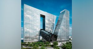 Архитекторы предлагают возвести здесь несколько многоэтажных корпусов: один в форме обрезанной буквы П, другой в форме прямоугольной трапеции. Соединить их, судя по рендеру, предлагается «упавшей» черной перекладиной: она наклонена и соединяется с буквой П на уровне седьмого-десятого этажей.