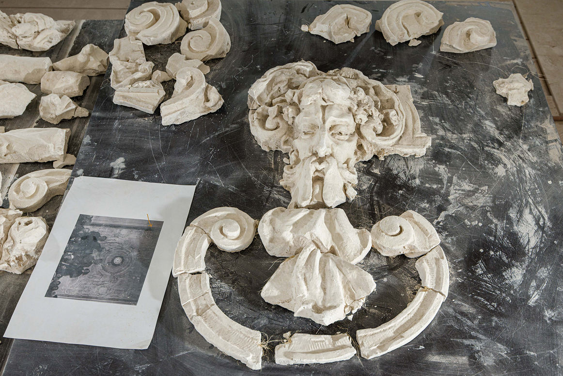 После изучения архивных документов реставраторы заключили, что найденные фрагменты относятся к лепнине из проекта архитектора здания Василия Косякова. Гипсовый барельеф украшал исторический зал, где позже открыли Третью студию Дома радио. По краям композиции были расположены два декоративных элемента в виде мужских голов, а в центре возвышались скульптуры двух юношей.