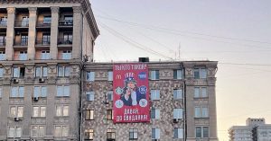 Этим утром на жилом доме напротив американского посольства на Новинском бульваре повесили огромный баннер высотой в три этажа — около девяти метров.