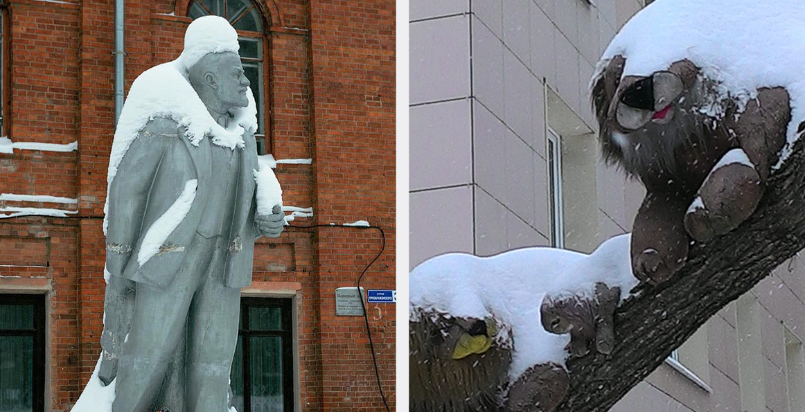 У погоды в последний месяц случилось биполярное расстройство — то рекордный плюс, то минус, то метель. На этих кадрах период налипания. На Ленина оно напало с объятиями.