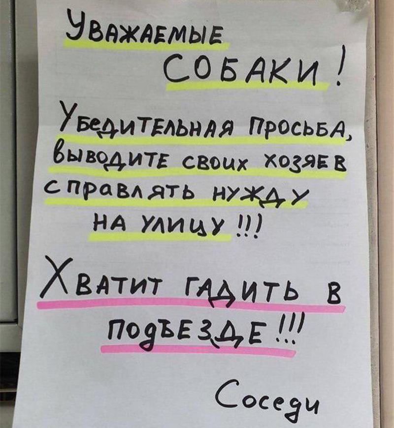 Москвичи опробовали все способы борьбы с какашками. Кажется, самый действенный — это объявление, но только не такое, а с фото страшной бабки и обещанием навести порчу на собаку по найденным фекалиям.