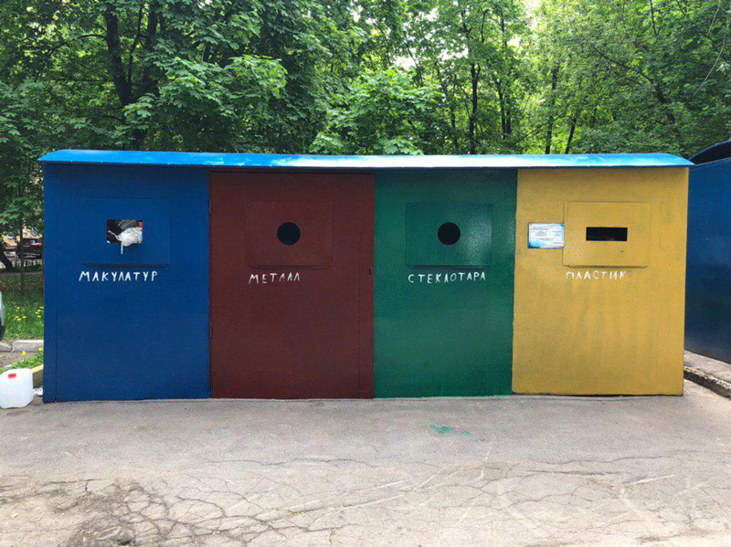 Во дворе на Ленинском проспекте покрасили контейнеры для раздельного сбора мусора. Ну что, все логично: металл, пластик, макулатур. Один кофе и один булка.