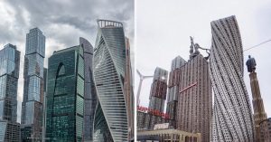 Выглядит так, будто искусственный интеллект решил поженить все стили разом: и сталинский, и брежневский, и лужковский. На крышу одного из небоскребов водрузили «Рабочего и колхозницу». А башня «Меркурий» внезапно стала аналогом Дворца Советов с Лениным на верхушке.