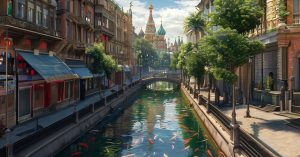 В фантазии нейросети, правда, краснодарская Москва выглядит скорее как знойная Касабланка. Пальмы высажены строго в ряд, людей на улицах немного — все греются под солнцем на пляжах и катаются на сапах. С Красной площади сняли брусчатку, и оказалось, что там тоже пляж. Возле Кремля департамент ЖКХ решил высадить пальмовую рощу возле воды, где теперь туристы сплавляются на лодках с фламинго. И собор Василия Блаженного почему-то поменял цвет куполов.