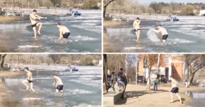 Видео с купальщиками из Солнцево появилось в телеграм-канале «Новости Москвы». Веселые парни в одних трусах выходят на берег, брызгаясь друг на друга водой, а вокруг них плавает лед.