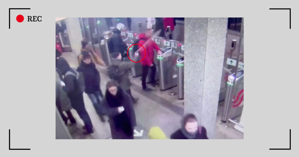 На «Кутузовской» двое пассажиров поссорились перед самым входом на станцию, и один из них, как видно на кадрах с камеры наблюдения, решил ускорить решение конфликта с помощью перцового баллончика — достал его и несколько раз распылил в лицо оппоненту.