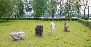 Из «Музеона» уезжают «Сфинкс» Дмитрия Тугари, «Замок» Алексея Григорьева, «В саду» Алексея Кочеткова и «Ева» Фахраддина Рзаева. Правда, все четыре скульптуры небольшого размера и как их планируют обыграть на Речном вокзале — непонятно, пока их просто выставили в ряд на пустой зеленой лужайке.