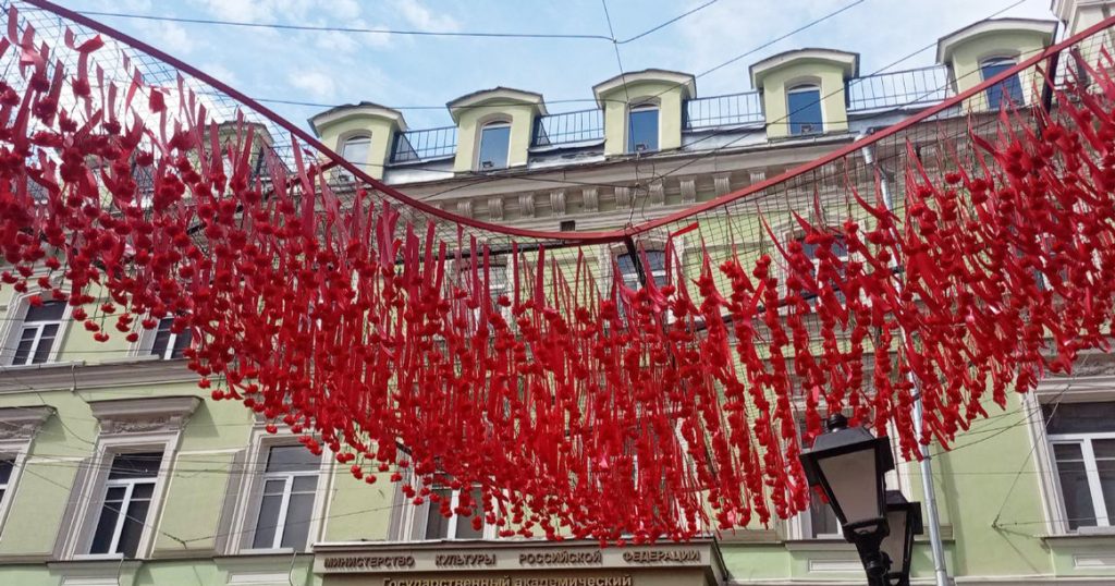 Теперь в воздухе над Никольской зависли красные ленточки с гвоздиками. Фотографии появились сразу в нескольких телеграм-каналах: на них видно, что сотни цветов (судя по всему, искусственных) подвешены за стебель головками вниз, а ленточки прикреплены к массивным металлическим конструкциям, закрепленным на специальных опорах.