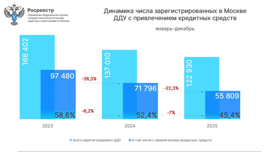 В московских новостройках ипотеку стали брать заметно реже. По итогам 2025 года число сделок с кредитом на первичке, по данным Росреестра, сократилось на 22,3% по сравнению с прошлым годом. Для рынка, который еще недавно жил на кредитах, это серьезное охлаждение.