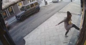 В телеграм-канале «Патриаршие» опубликовали видео, на котором разъяренная девушка пробила ногой дверь в Большом Козихинском переулке и пошла дальше. Одета девушка при этом аккуратно: в дубленку, шапку, в руках айфон и шопер.