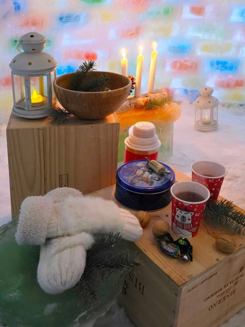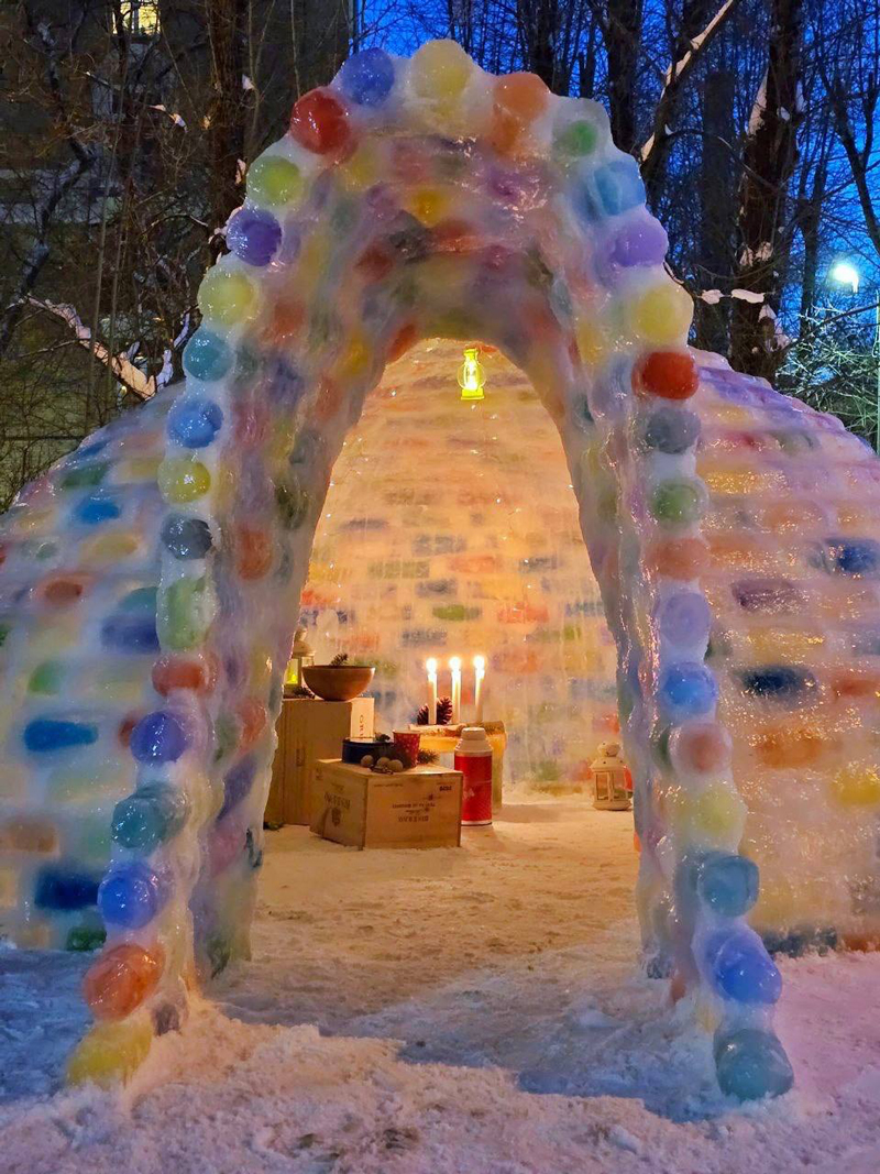 Сегодня иглу выглядит как полноценное общественное пространство. Внутри — мягкий свет фонариков, свечи, деревянные ящики вместо столиков, чай в термосах, печенье и еловые ветки. Такое хюгге по-щукински. У постройки даже есть собственная табличка, где сообщается, что иглу было возведено за две недели, подробно расписаны способ строительства и материалы — вплоть до упаковок и пищевых красителей.