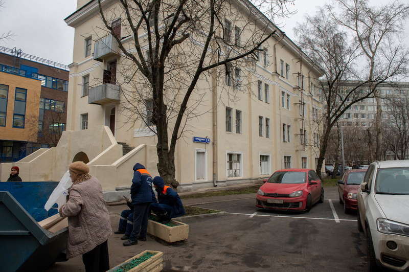Абельмановская Застава входит в конструктивистское кольцо Москвы: в 1920–1930-х город разрастался за пределы Камер-Коллежского вала, и здесь появлялись новые школы, фабрики-кухни, рабочие поселки и больницы. Дом, краешек которого я увидел из-за стены монастыря — это как раз бывшая школа, построенная американской компанией «Лонгэйкр» в 1930-м, затем превратившаяся в больницу. С разных сторон площади есть еще несколько конструктивистских зданий, сохранившихся с конца 1920-х, и, если присмотреться к их фасадам, видно, как «голый» конструктивизм обрастал пафосным сталинским ампиром. Вот, например, лаконичная ниша на четыре окна (два на четвертом этаже и два сверху на пятом) на фасаде семиэтажного дома на углу Абельмановской и Талалихина. Со временем ее декорировали портиком с треугольным фронтоном и двумя ярусами колонн. А потом один из жильцов — тот, что справа внизу — решил свой балкон застеклить: с сайдингом и пластиковыми окнами. Так стремление к функциональности и тяга к прекрасному сменяют друг друга на одном отдельно взятом фасаде, образовывая фирменный московский палимпсест. Санки на застекленном балконе в окружении портика и колонн — очень точная метафора этого города для меня.