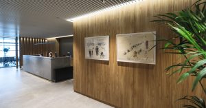 За современность дизайнерских решений отвечает стилистика и подбор материалов. Архитектура современная, формы строгие, цвета приглушенные, природные — серый, графитовый, черный, теплое дерево. Материалы — камень, керамогранит, рельефные стеновые и шпонированные панели. Потолки в здании невысокие, поэтому в коридорах они оставлены открытыми — видно все коммуникации (они покрашены в черный), и это придает обстановке налет благородной брутальности.