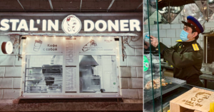 Закусочная с шаурмой под названием Stal’in Doner открылась 7 января недалеко от станции метро «Войковская». То есть в тестовом режиме она заработала еще перед Новым годом и сразу привлекла к себе много внимания. И понятно почему. В довершение к вывеске шаурму в заведении продавал сотрудник в форме НКВД, а в меню значились блюда «Сталинская двойная с мясом», «От Берии с соусом ткемали» и «Хрущевская в сырном лаваше».