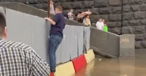 «Один из этапов “Форта Боярда” проходит в этом году на Бронной. Участникам предстоит пройти путь над бурной рекой, удержаться на скользких поверхностях и найти выступы, за которые можно зацепиться», — пишет телеграм-канал «Патриаршие», опубликовавший видео, как люди карабкаются по решетке, потому что улица стала рекой.