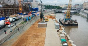На берегу и на воде работают несколько подъемных кранов. Это начали расширять набережную возле ГЭС-2. До конца лета тут обещают высадить березовую рощу, а полностью открыть центр хотят к концу 2019 — началу 2020 года.