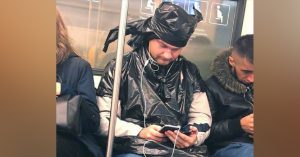 Демна Гвасалия объяснял появление сумки в виде мусорного пакета тем, что любит скандалы в мире моды. Любит ли их пассажир метро, натянувший на себя мусорные пакеты, неизвестно. Возможно, дело только в удобстве — такая одежда точно защищает от всех осадков. Непонятно, правда, почему костюм без длинных рукавов — получилась такая футболка. Зато небрежно замотанный полиэтиленовый тюрбан определенно добавляет образу естественности.