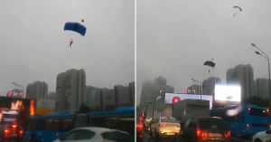 Инцидент, конечно же, не мог не попасть на камеры — один из проезжавших водителей записал видео поразившего его десанта. «Просто еду по Ленинскому, и типы с парашютом… летят. Уже третий! Четвертый!» — считает экстремалов автор ролика. Они едва не приземлились прямо на машины, впрочем, удалось попасть на газон между тротуаром и проезжей частью. Судя по всему, спрыгнули парашютисты с одного из высотных зданий в округе. На этом настаивает телеграм-канал Baza, опубликовавший видео одним из первых.