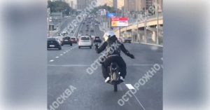 Заметив, что его снимают, лихач начал показывать свое мастерство — вставать на дыбы и ездить без рук. И все это на скоростной магистрали.